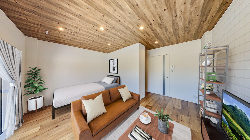木目の天井と床、優しい色合いのインテリアが特徴的なナチュラルデザインのリノベ部屋です。