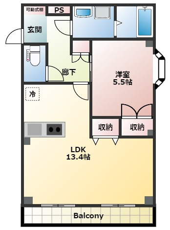 ご紹介するのは、LDK13.4帖の広々とした対面カウンターキッチンが魅力の1LDK賃貸物件です。