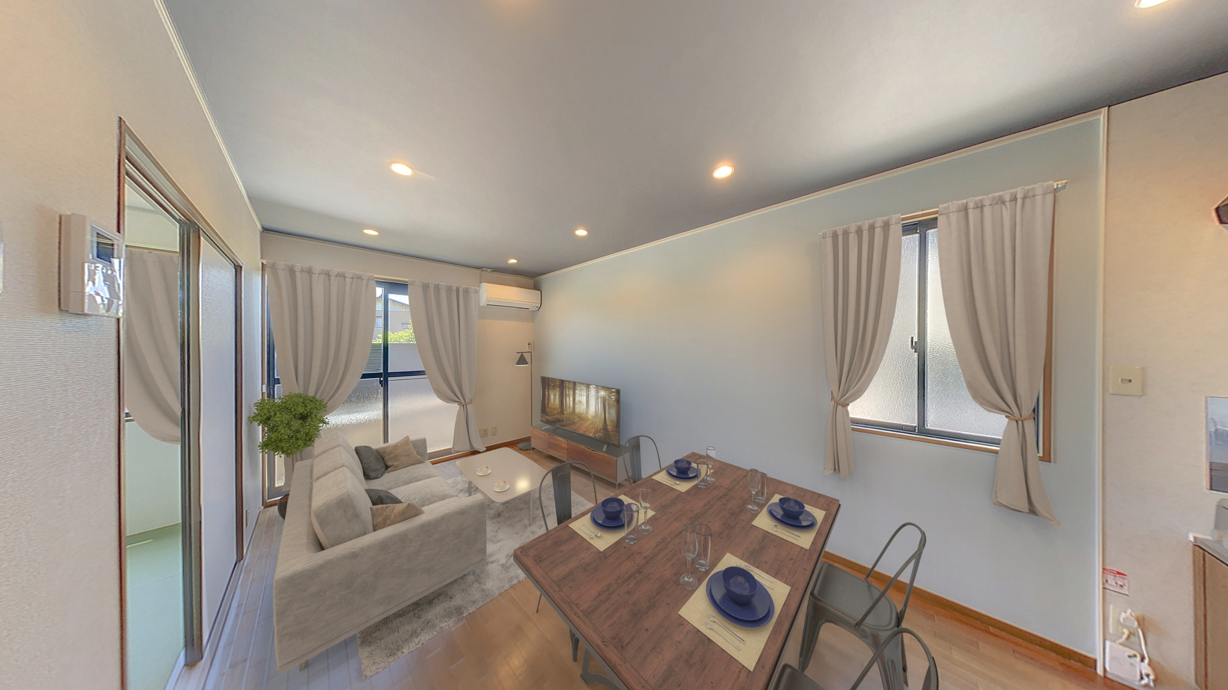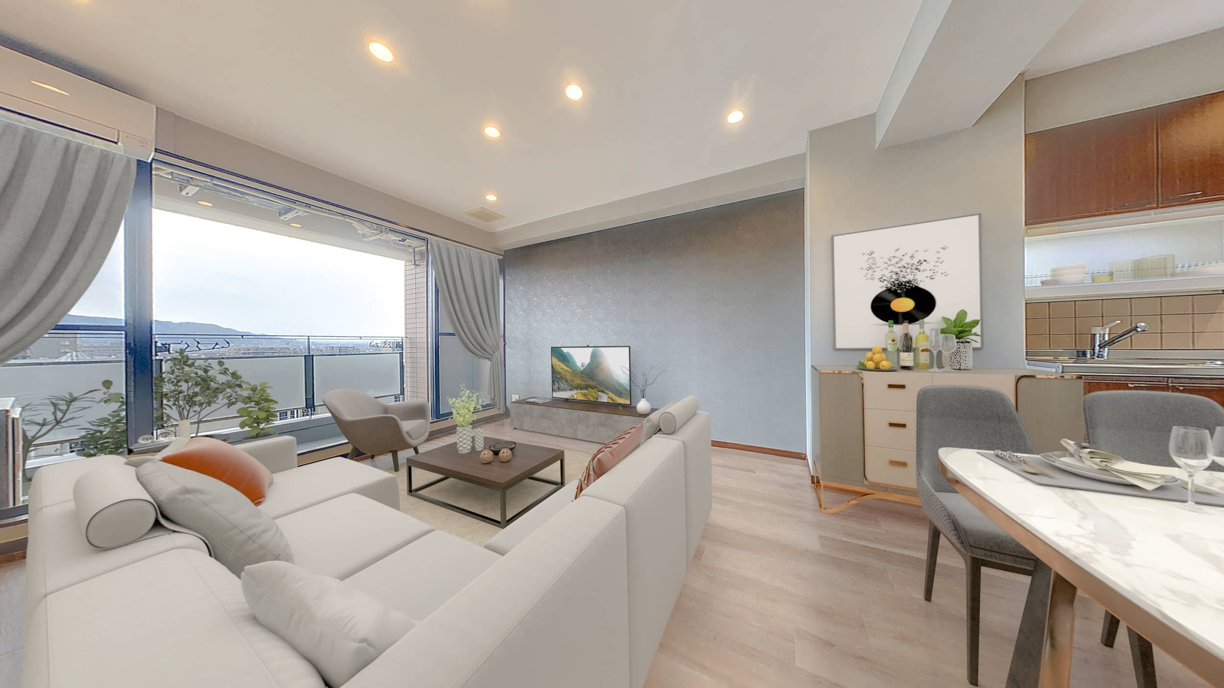大きな窓からの自然光と、ホワイトやグレーのカーテンが生み出す抜け感で、リビング・ダイニングは明るく開放的な印象となります。