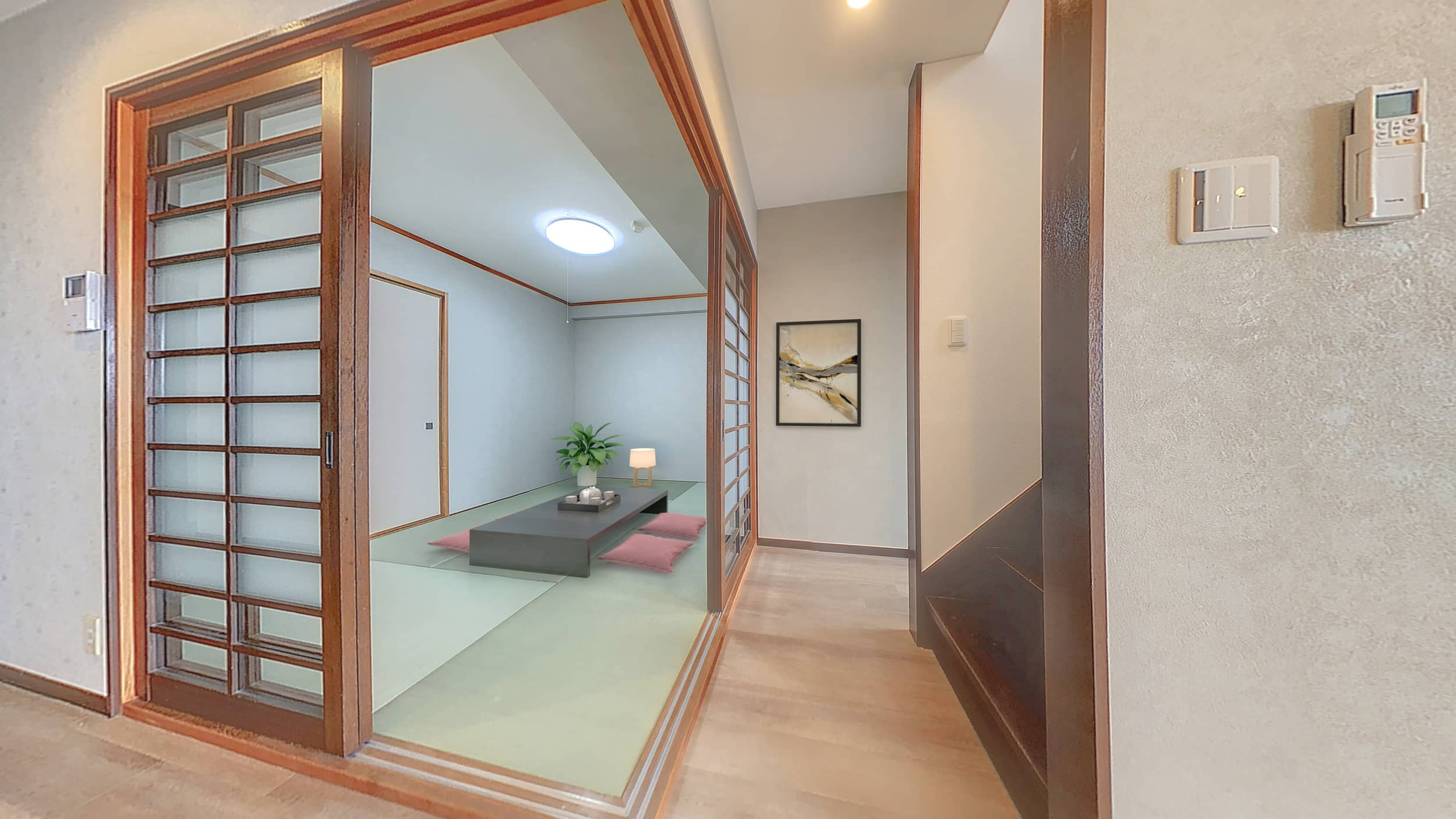 シンプルな淡色クロスと畳を基調とした隣接和室は、ナチュラルなグリーンと柔らかな壁色が心地よく馴染み、観葉植物やランプを加えることで、和の落ち着きとモダンな爽やかさを兼ね備えた空間に仕上がっています。