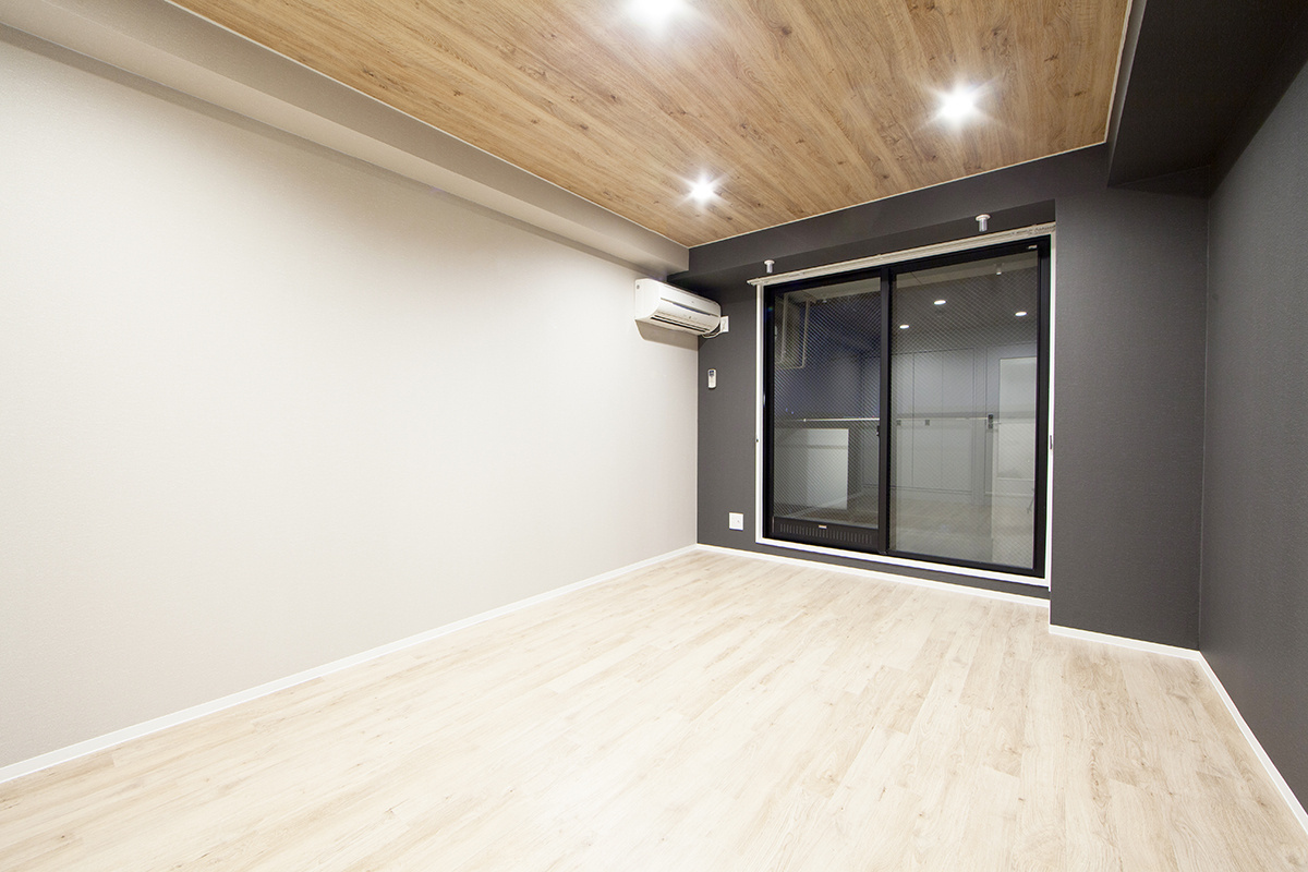 天井の木目とアクセントウォールのダークグレーが印象的な一室。