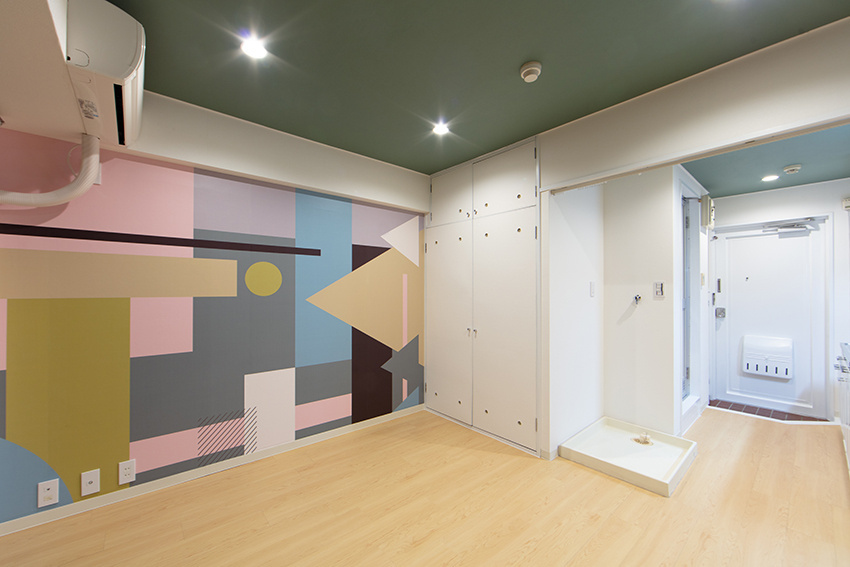 壁一面に描かれた幾何学模様のアートが印象的なこちらの物件は、まるでギャラリーのような空間です。