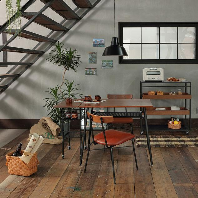 具体的には、テーブルやシェルフの脚部、棚受けやバー、ハンガーラックなど、フレーム構造の部分にアイアンが使われていることが多く、空間のアクセントとしても人気の高いアイテムです。