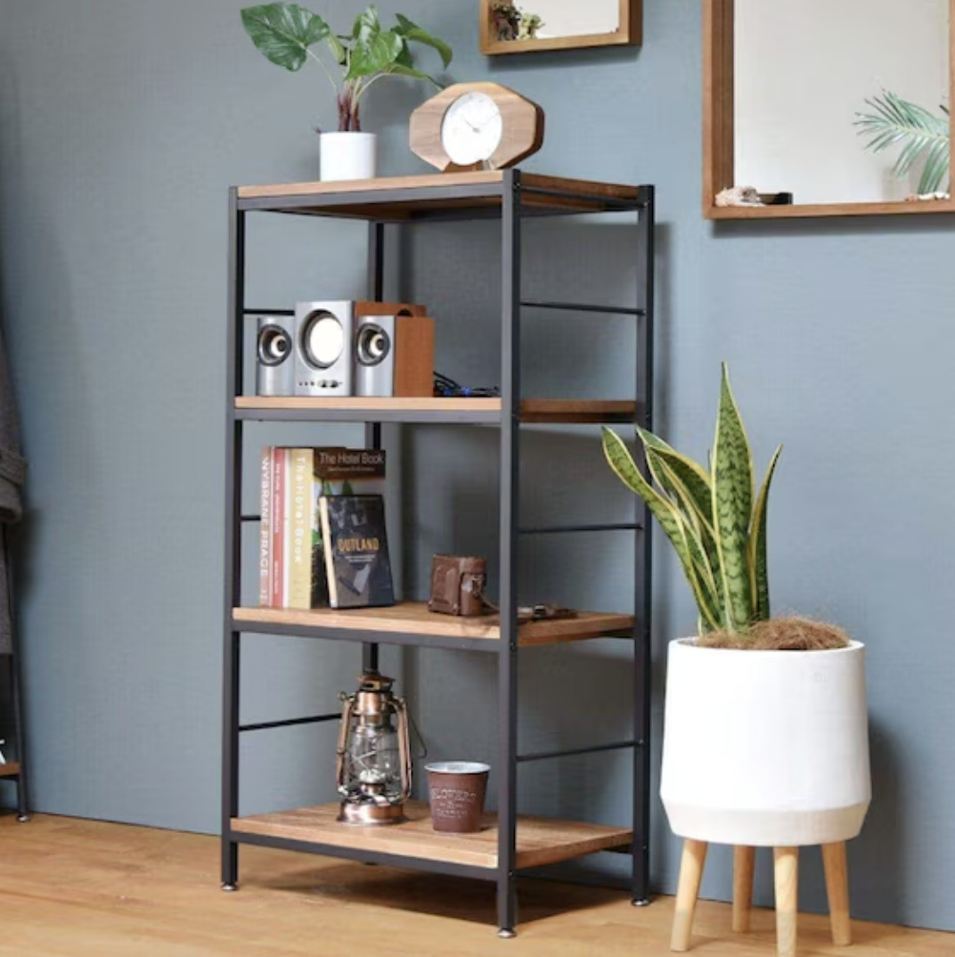 最初の一手は、黒アイアン×古材の棚+真鍮風ランプのセットが王道です。