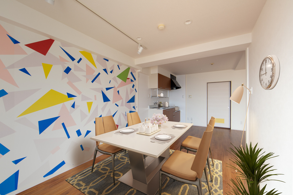 3つ目にご紹介するのは、カラフルな幾何学模様が大胆に施されたダイニングスペース。