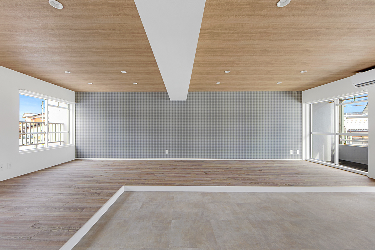 天井はグレー系でトーンダウンさせ、ほどよい抜け感と落ち着きを演出しています。