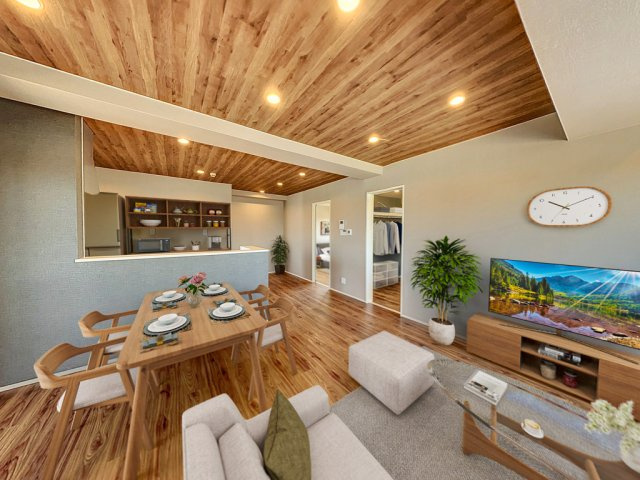 写真のように、床だけでなく天井にも木の表情を入れるデザインは、 まるでカフェや北欧ホテルのような落ち着きを生み出します。