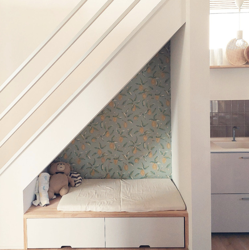 普段あまり使われない階段下は、まさにヌック向きの隠れた名スポットです。