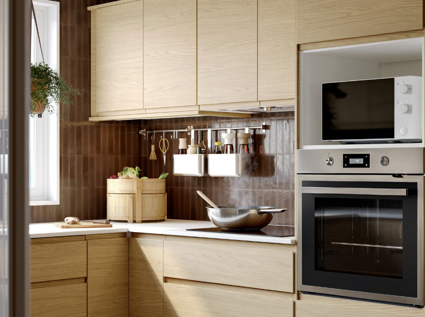 棚板の素材やカラーを、家電のテイストに合わせて選ぶことで、キッチン全体が統一された空気感になります。