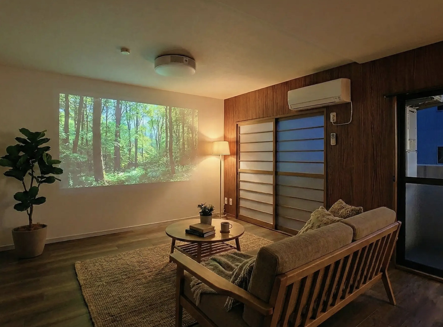 「THEATER WOOD LIFE」は、popIn Aladdinによる大画面体験に加え、木の温もりと白壁のバランスで、没入とくつろぎを両立できるのが魅力です。